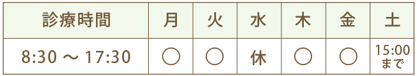 休診日 : 水曜・日曜・祝日 ※最終受付時間は診療終了時間の30分前までです。